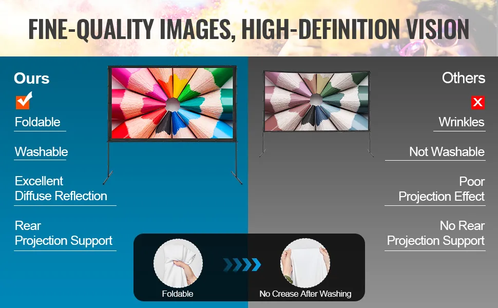 This screen is wrinkle-free. It ensures clear and crisp images. The screen material is designed to prevent any wrinkles or creases, so you get a smooth surface for projection. This is especially important for clearly viewing high-definition content. Our projector screen uses high-quality polyester oxford cloth. It is durable and easy to clean. Additionally, the material shines white, increasing the brightness and enhancing the colors of your projections in both indoor and outdoor settings.