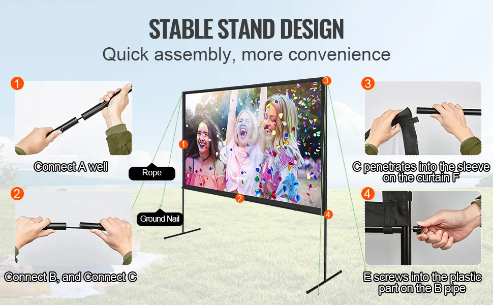 The VEVOR projector screen is made to be stable and secure. It includes bar feet that provide a solid base, preventing it from falling over. Even in light winds, the screen remains stable while in place. This is important for outdoor use, where wind can be incredibly common. The screen also comes with ground stakes and ropes for added stability. These features guarantee that the screen won't topple over during your movie night.