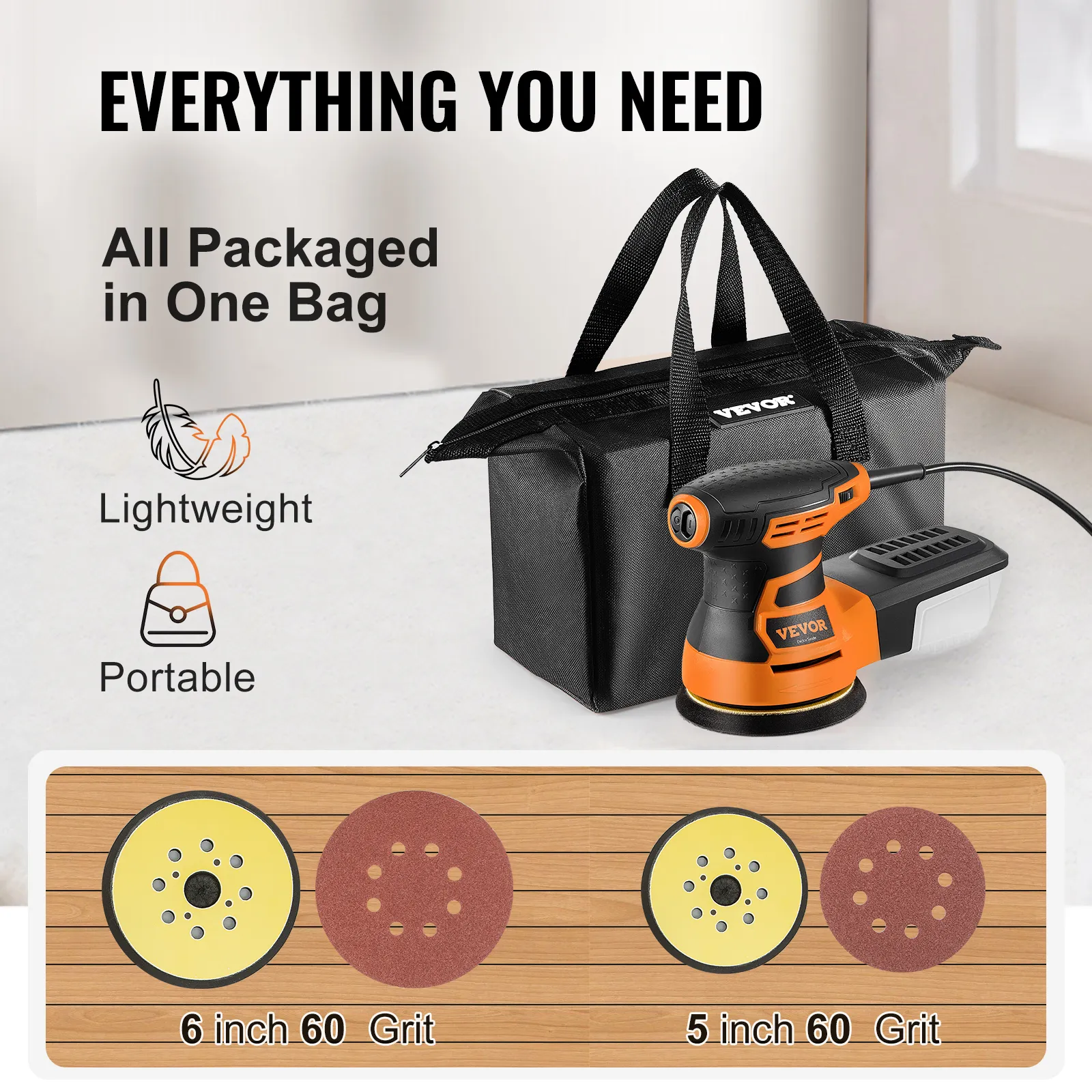 Our sander for woodworking comes with 5-inch & 6-inch sanding pads and sandpapers (60 Grit) to meet your different sanding needs. All accessories and the machine can be packaged in a one-handed bag.