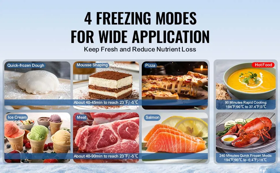 Different foods need different cooling methods, and this energy-efficient chiller makes it simple. These modes include soft freeze, shock freeze, freeze, and hard chill. Whether you are storing ice cream, cakes, salmon, or lobster, there is a mode to match. These settings protect both flavor and texture, offering you perfect results every time. Additionally, innovative features make it simple and safe to use. These features include smart alarms, precise temperature control, automatic defrosting, and overload protection. Chefs can focus on cooking without any worries about equipment issues or mistakes.