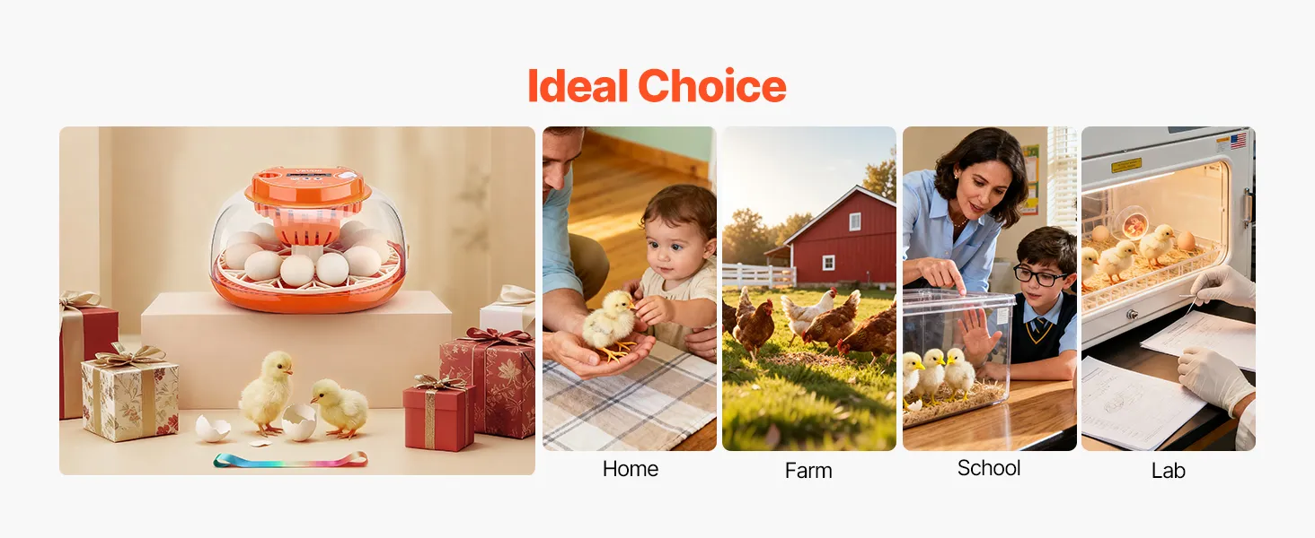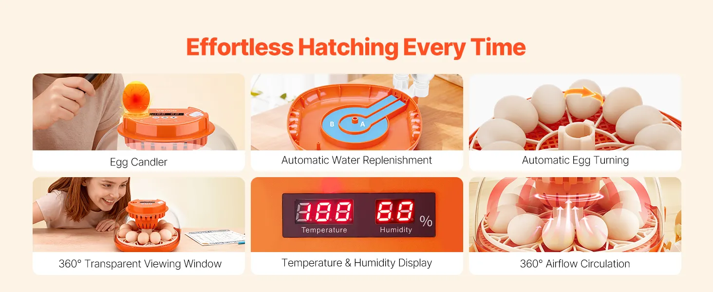 Automatic Egg Turning: Designed to mimic a mother hen’s gentle care, this egg hatching incubator automatically turns eggs every 2 hours for 10 seconds. It avoids embryo adhesion while ensuring even heating and proper chick development