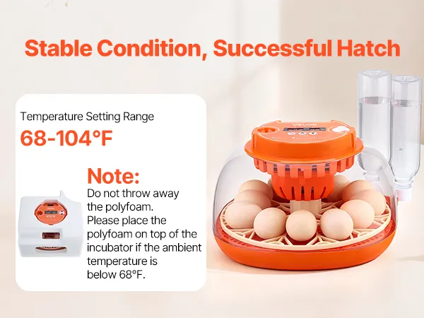 Q2: What are the precautions for hatching? A2:1. Put machine into foam if environment temperature bellowed 20°C/68°F for better warm keeping. 2. Do not open the lid frequently during incubation, it'll make the unbroken eggshell dry out and difficult to be broken. Q3: What are the precautions for eggs candling? A3:1. Dim the room lighting for easy observation. Please take care to avoid excessive vibration or rotation during candling the eggs, which may cause death of embryos due to stress. 2. Due to the room temperature is lower than the incubator temperature, please complete the operation of candling eggs as soon as possible.