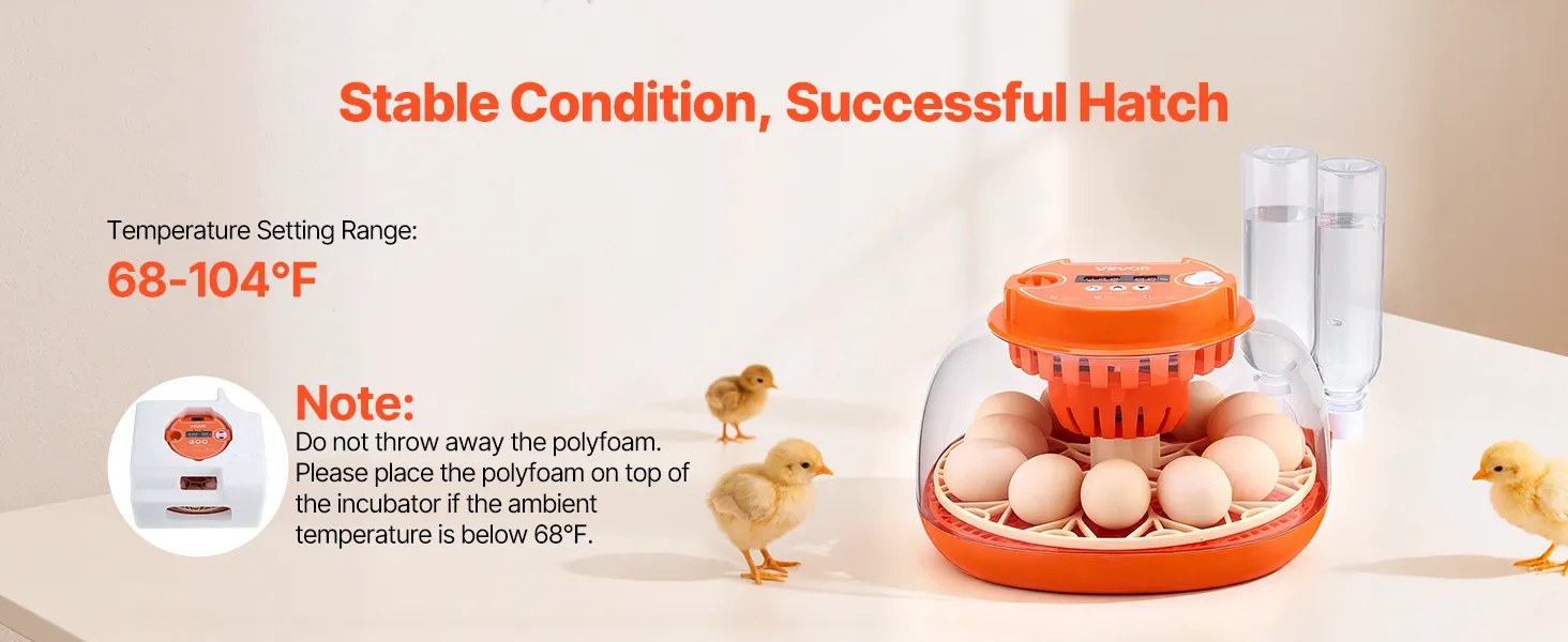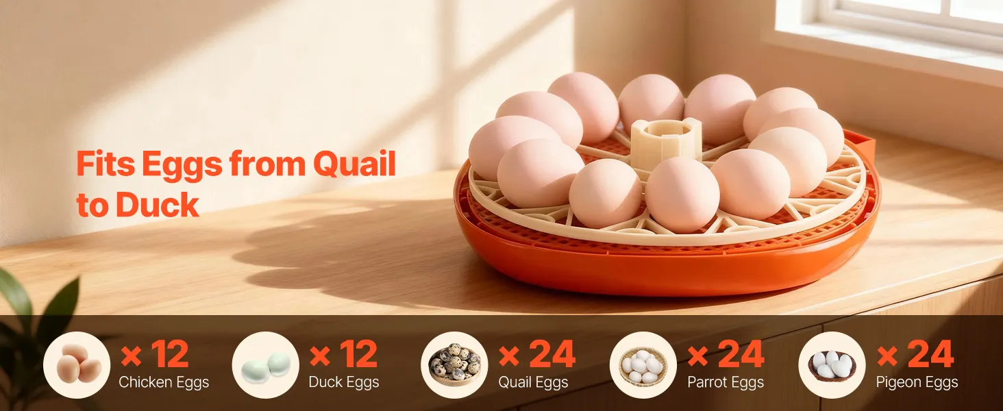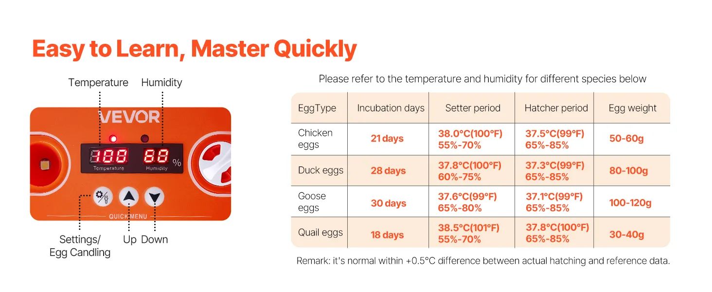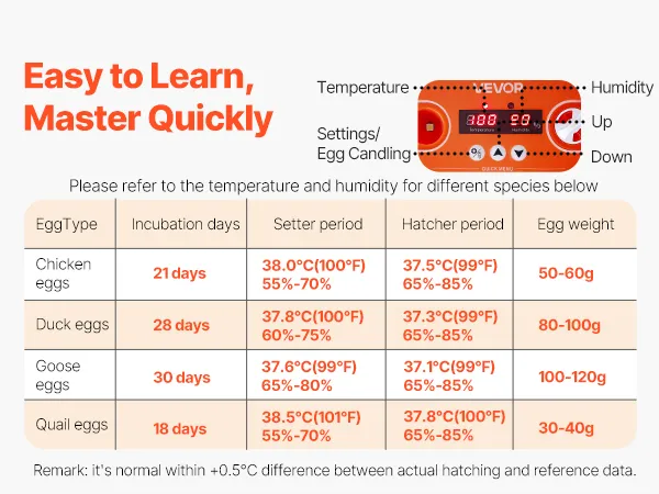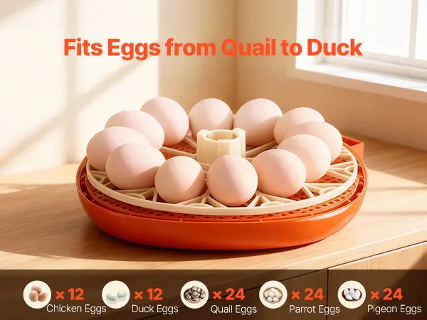 Easy to Operate & Clean: Featuring a simple design, this duck egg incubator is easy for beginners to use. The top lid can be wiped with a damp cloth, and the base and components are washable, making cleaning quick and effortless