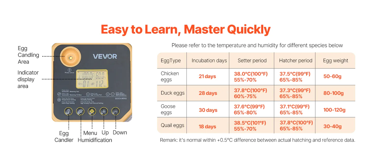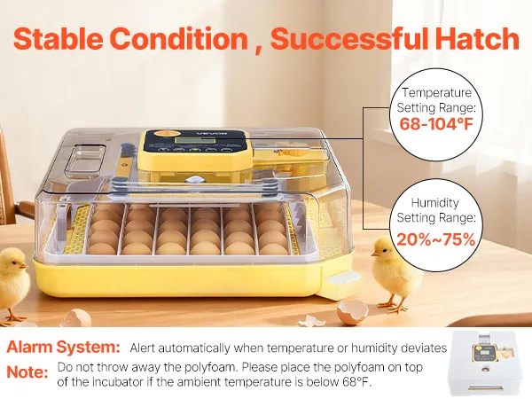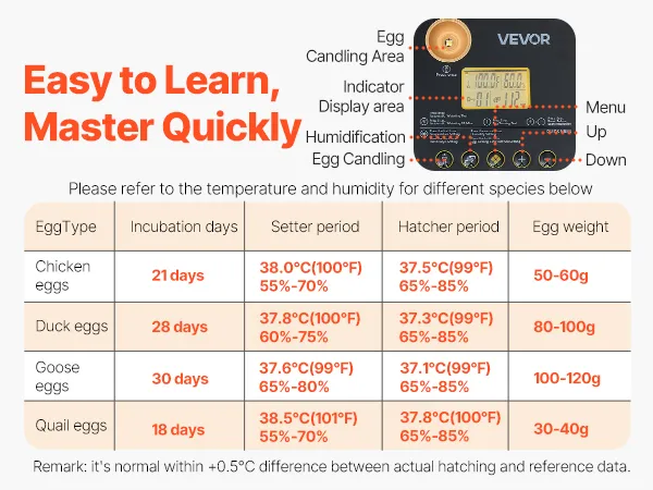 Digital Display & Precise Control: Our incubator for hatching eggs features an accurate digital display of temperature and humidity, with a 68-104°F range and a humidity range of 20-75%. Its 360° air circulation evenly distributes temp-humidity
