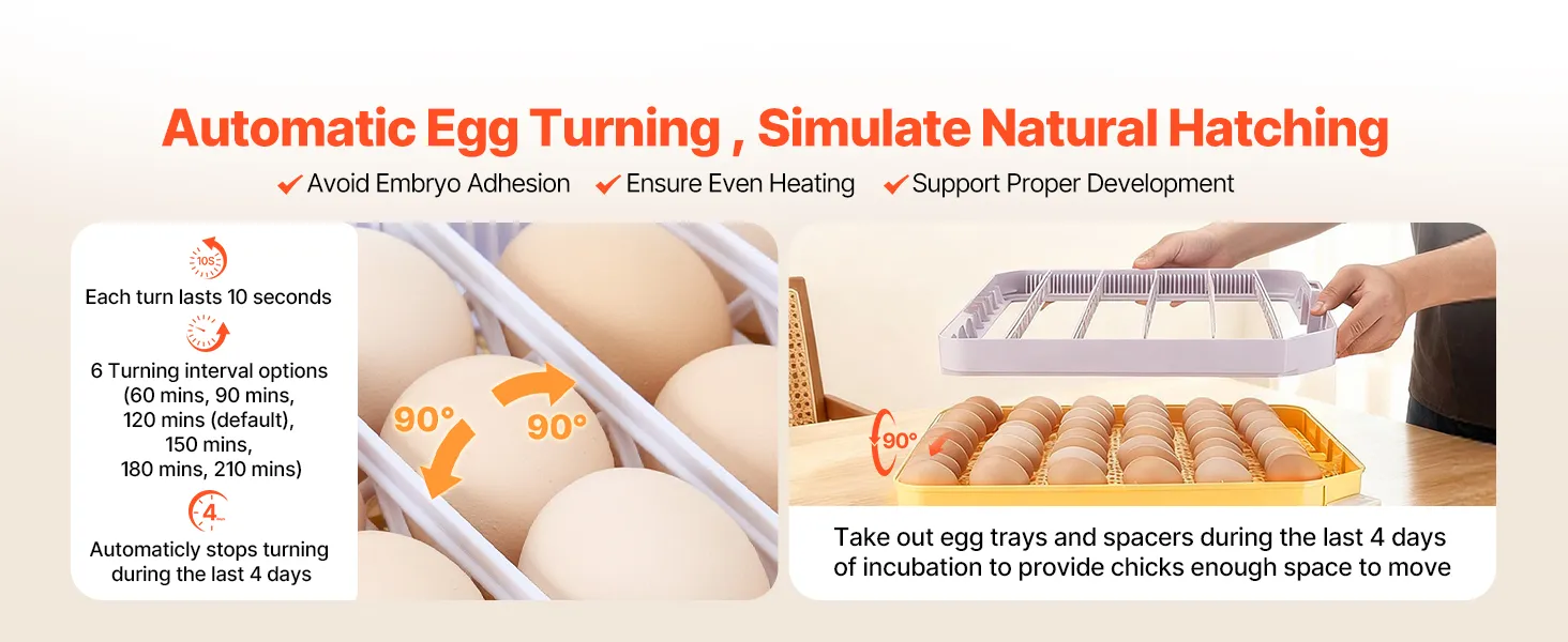 180° Automatic Egg Turning (One Turn): Designed to mimic a mother hen’s gentle care, this egg hatching incubator gently turns eggs automatically with six selectable intervals, each lasting 10 seconds. It avoids embryo adhesion while ensuring even heating