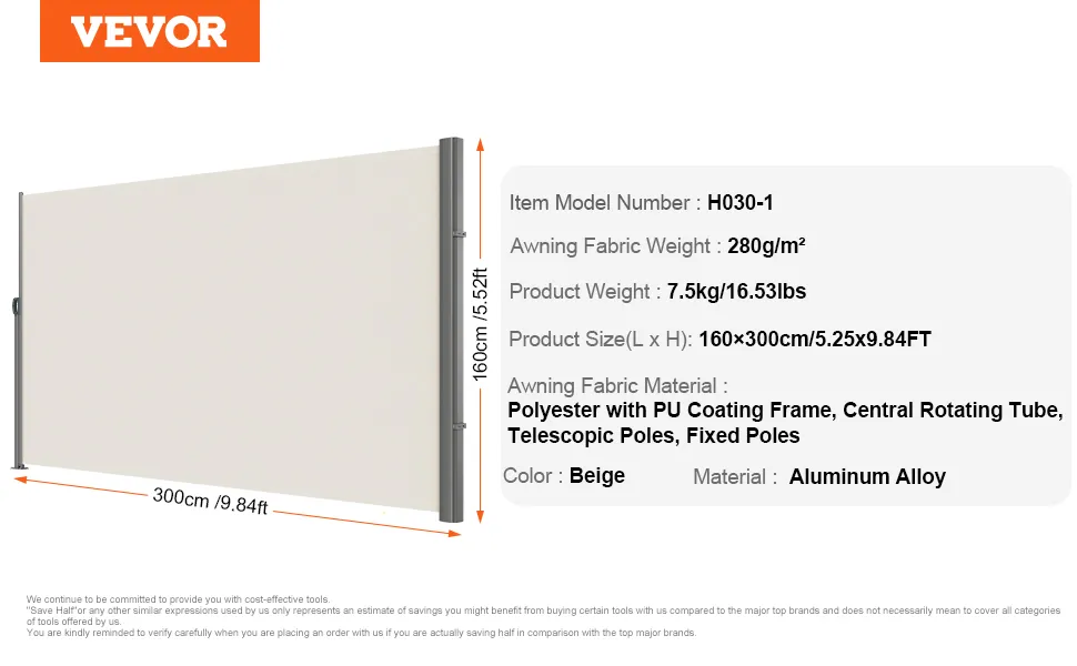 It has dimensions of 160x300 cm (5.25x9.84 feet). This outdoor privacy screen provides ample shading area. It is ideal for balconies, courtyards, or commercial spaces. You can enjoy privacy and protection from wind and low-angle sunlight. The modern minimalist design matches various outdoor environments and decor styles. The practical design ensures that you create a private and comfortable outdoor space. Its size and style allow this awning to be used in any setting.