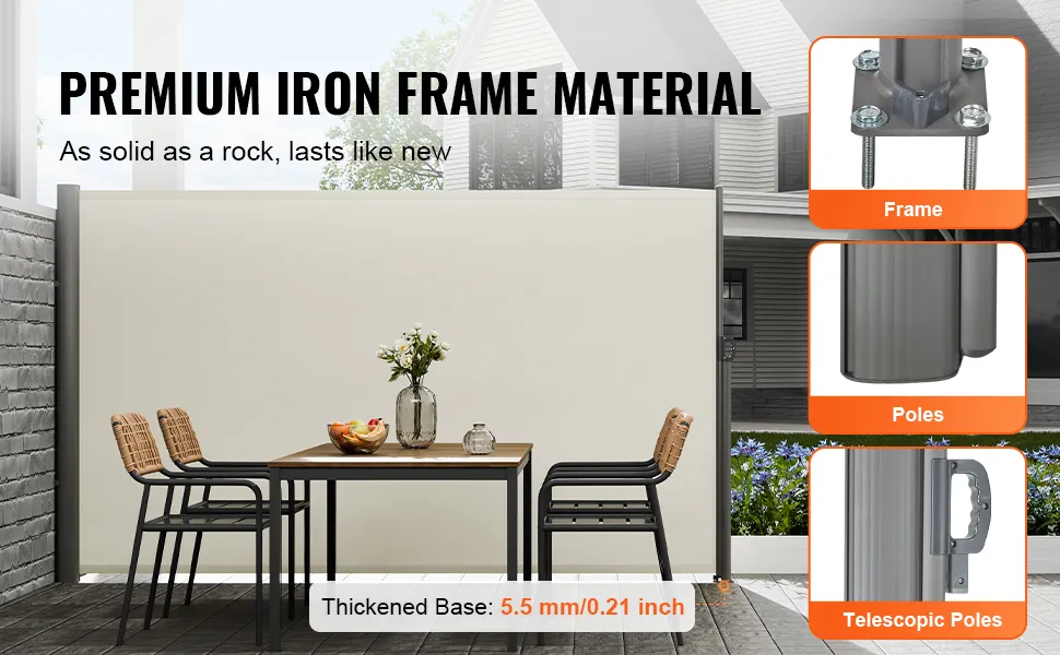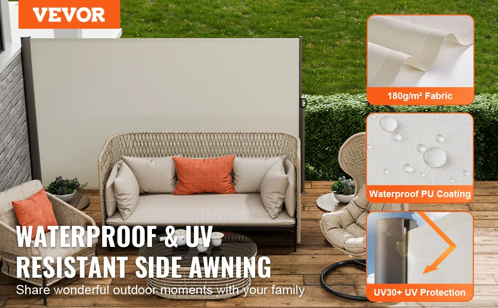 Achieve a strong and durable solution for outdoor privacy with the VEVOR beige retractable awning. It features a strong aluminum alloy frame. This frame is coated with a protective powder finish, which improves its resistance to corrosion. The frame's innovative design includes a tilt of 2° on the support poles. It adds height while preventing fabric stains. That ensures a sleek appearance and high stability in various weather conditions. The structure of this aluminum side awning is both sturdy and stylish. So it's perfect for long-term outdoor use.
