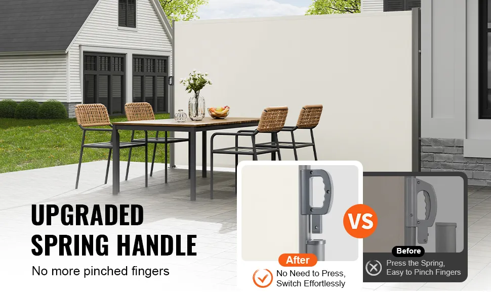 The patio privacy divider has a spring mechanism that allows for smooth and effortless operation. You just need to simply pull or push the handle to adjust the extension and retraction of the awning. The upgraded spring handle prevents pinching, improving user experience. It ensures that you can easily control the amount of shade or privacy you need at any given time. The outdoor retractable awning’s design is user-friendly, requiring minimal effort to operate, making it accessible to everyone.