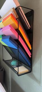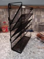 Awesome little racks. Completely enclosed with the metal mesh, except ofcourse the front where the files get placed in or taken out of the rack, to keep all of your files and anything you put on the bottom shelf from falling out. The bottom shelf is a nice little bonus as well for you to put your keys or ear buds or whatever you dont want to carry in your pocket for the day. I do wish it had securement holes in the bottom though. That way it helps keep your rack straight during its time of use and also that little piece of mind that it ain't going nowhere, like falling off the wall, would be nice. Not to worry though. A drill solved that problem for me. The hooks that come with it are kinda pointless, IMO, without dedicated slots or holes to hold them in place. They kinda just slide around on the lip of the bottom shelf. Overall though, it's a good product and I can see getting plenty of good use out of this for a long time to come.