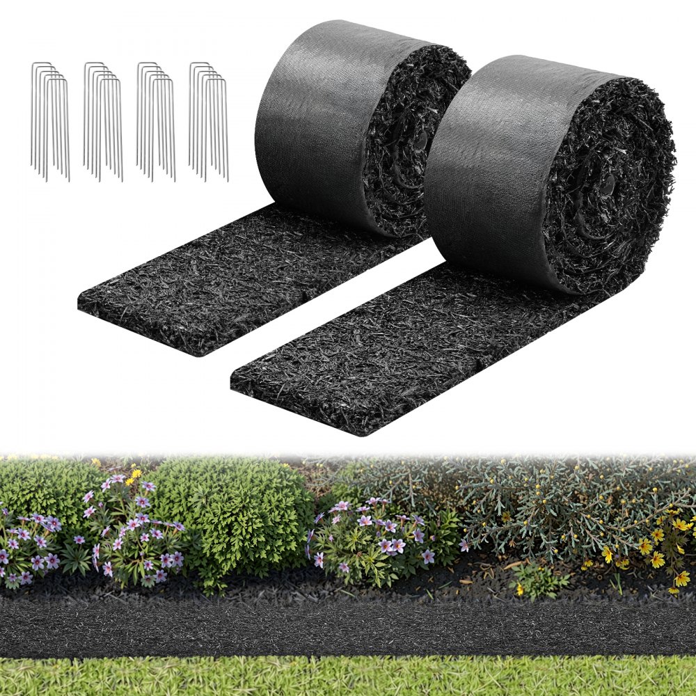 VEVOR Rubber Mulch Mat Roll, 2 Rolls 120 x 4.5 in, Recycled Rubber Permanent Mulch Edging Border, Natural-Looking Flower Barrier with Stakes, 0.5 in Thick Cuttable Garden Edgings for Landscaping