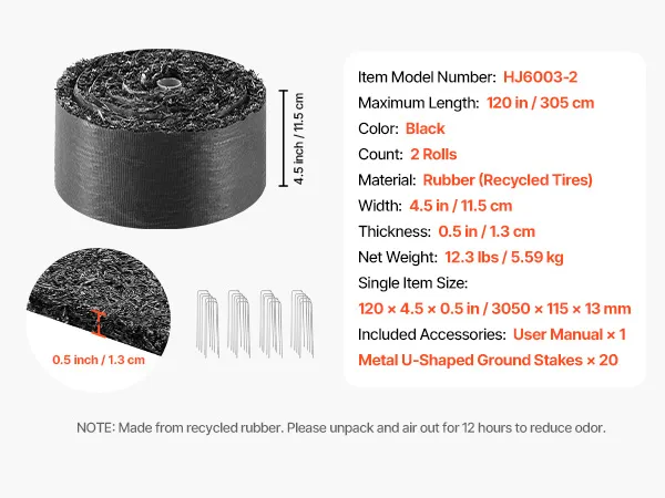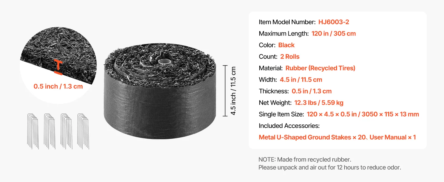 Upgraded Durable Construction: This 2-pack 120 x 4.5 in/3050 x 115 mm rubber mulch mat (0.5 in thick) is made from 100% recycled rubber fiber with green-energy adhesive. Wear-resistant, weatherproof, and reinforced with backing to avoid tearing. No special maintenance required