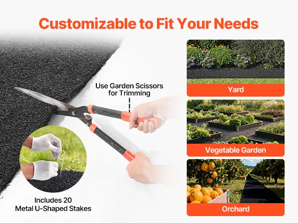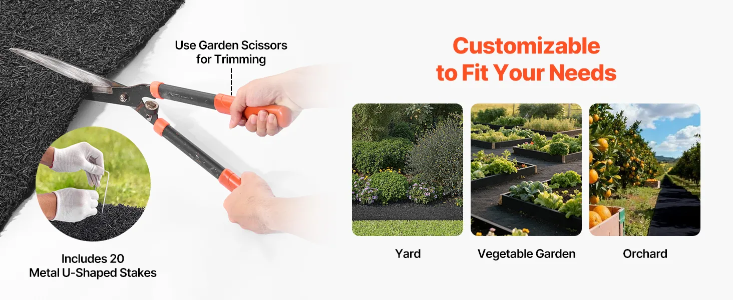 The recycled rubber mulch roll can be trimmed effortlessly with gardening scissors to fit your space or layout. Includes metal U-shaped stakes for easy securing. It is ideal for yards, vegetable gardens, and orchards.