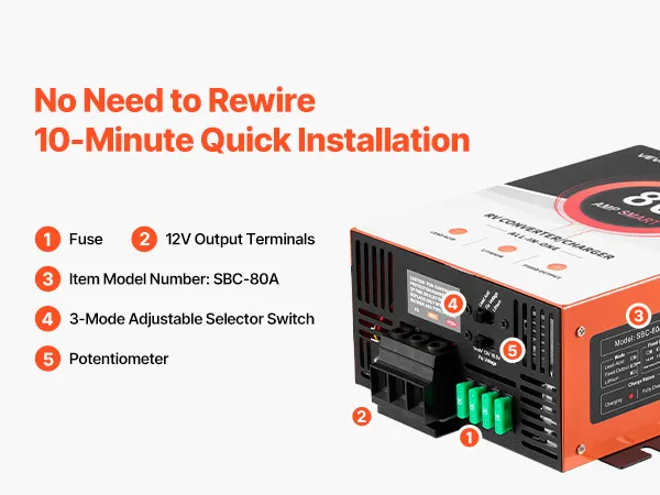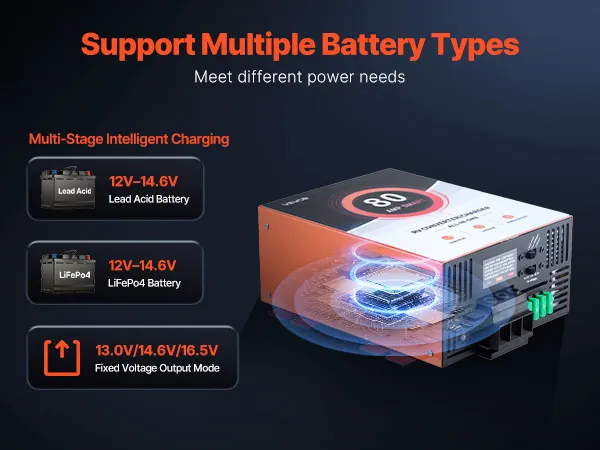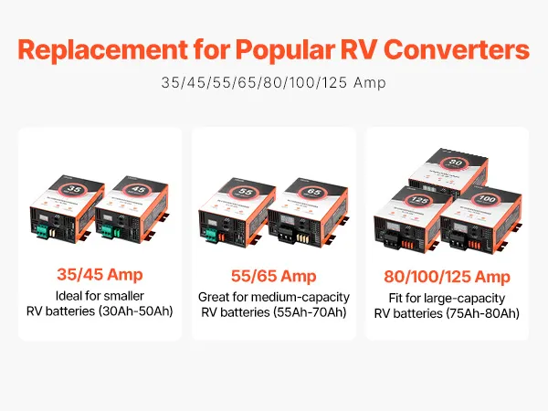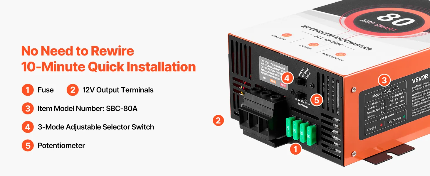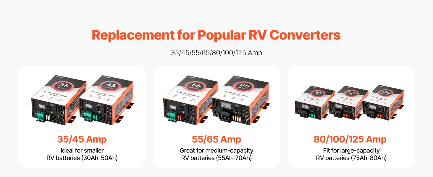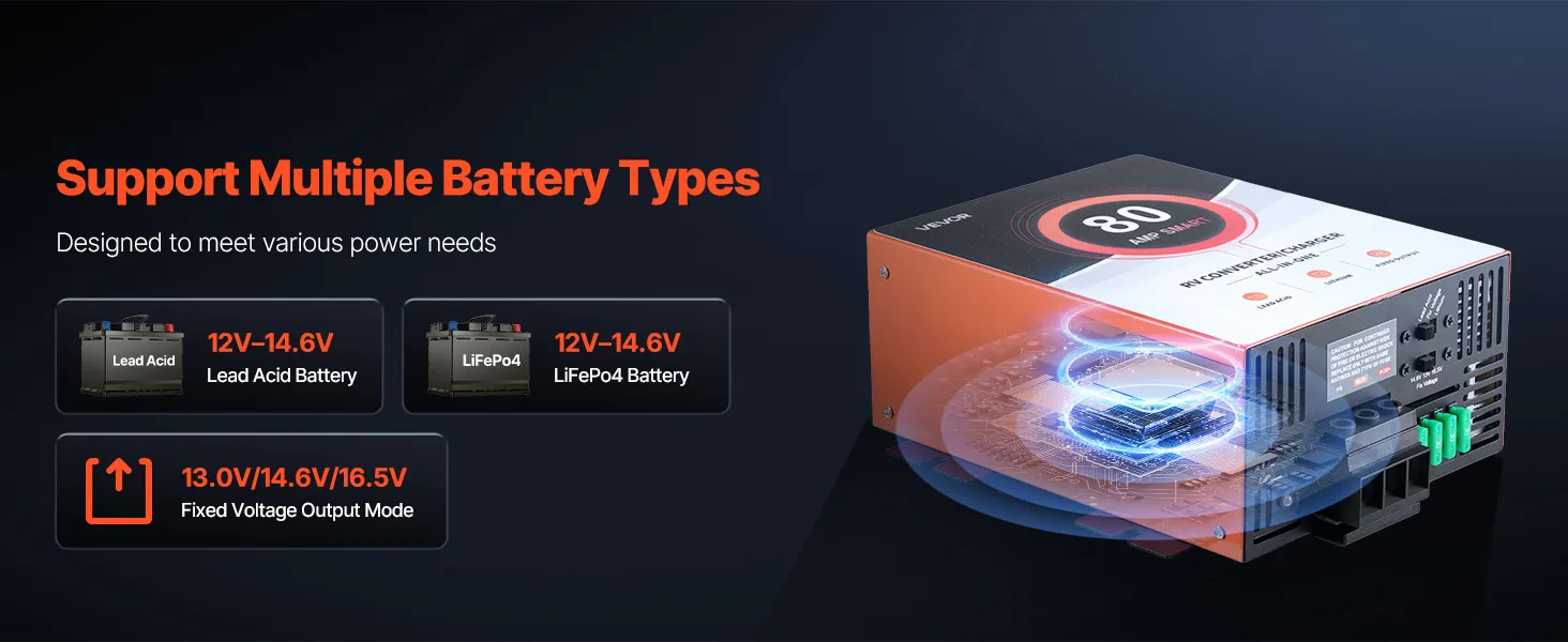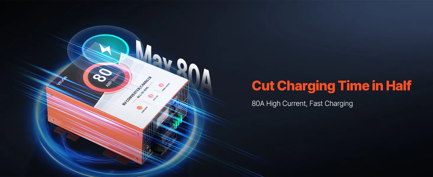 80 Amp High Performance: Delivers up to 80A clean and consistent current. Our RV converter charger powers your essential RV electronics, such as lights, speakers, and more. Suitable for large-capacity RV batteries rated 75Ah–80Ah