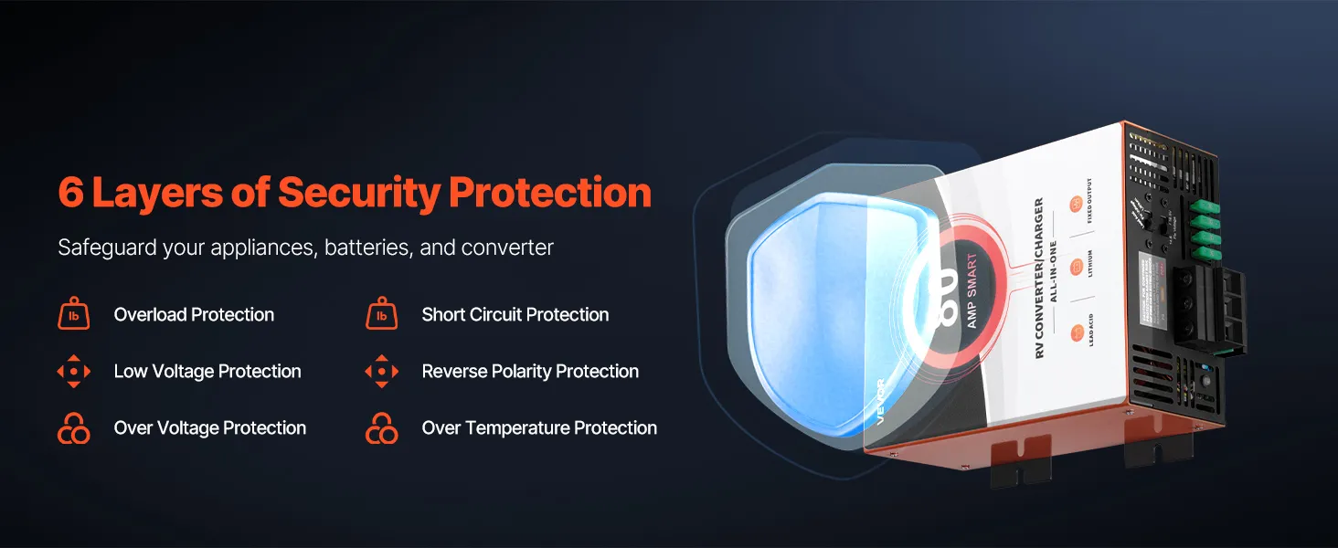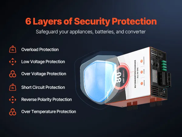Quickly converts 120V AC to reliable 12V DC power for your RV and camper users. Compatible with both LiFePO4 and lead-acid batteries, this RV converter features multi-stage smart charging and a high 80-amp output for fast charging. With multiple protections, it ensures peace of mind for every trip.