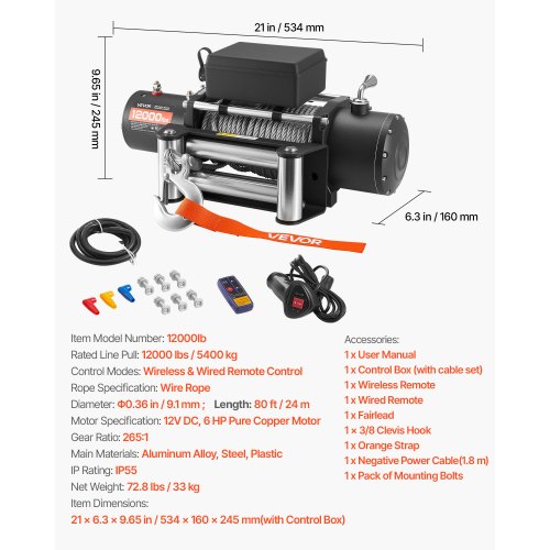 VEVOR Electric Winch, 10000 lbs Load Capacity, 12V DC Truck Winch with Φ21/64 in x 65 ft Steel Rope, Wireless & Wired Remote Control, IP55 Waterproof for Towing SUV Jeep Trailer Boat Off-Road Vehicle