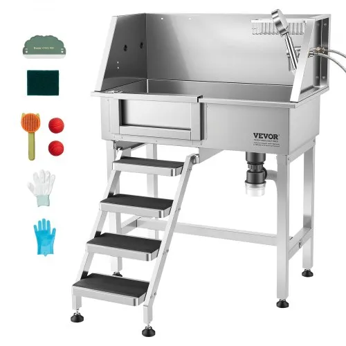 VEVOR 34 Inch Stainless Steel Dog Washing Station, Pet Grooming Tub with Hot & Cold Faucet, Showerhead, Home Wash Sink,, Fits Small Cats and Dogs, Non-Slip Stairs (Right Door)