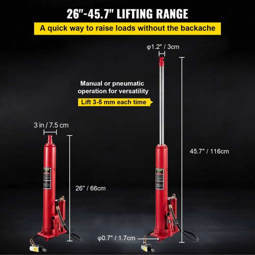 VEVOR Hydraulic/Pneumatic Long Ram Jack, 8 Tons/17363 lbs Capacity, with Single Piston Pump and Clevis Base, Manual Cherry Picker with Handle, for Garage/Shop Cranes, Engine Lift Hoist, Red