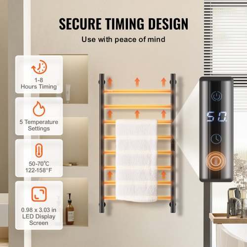 VEVOR 4 Bars Towel Warmer Rack, Wall Mounted Heated Towel Rack for Bathroom, IPX5 Waterpoof Towel Heater Rack with Timer & LED Display Screen, 5 Levels Adjustable Temperature Towel Heater, Black