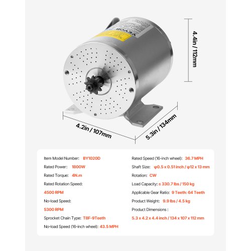 VEVOR 1800W Electric Brushless DC Motor, 48V 4500rpm Go Kart Electric Motor, Electric Dirt Bike Motor Engine for E-Bike Motorcycle Scooter DIY