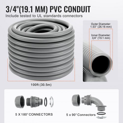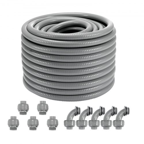 VEVOR 3/4-Inch Flexible Electrical Conduit, 100 ft, PVC Liquid-Tight Conduit Non-Metallic with 5 Straight and 5 90-Degree Conduit Connector Fittings, for Air Conditioning Motor Controller Pump, IP65