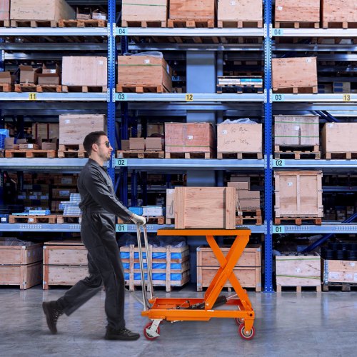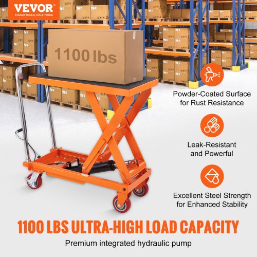 VEVOR Hydraulic Lift Table Cart, 500lbs Capacity 28.5" Lifting Height, Manual Single Scissor Lift Table with 4 Wheels and Non-slip Pad, Hydraulic Scissor Cart for Material Handling, Orange