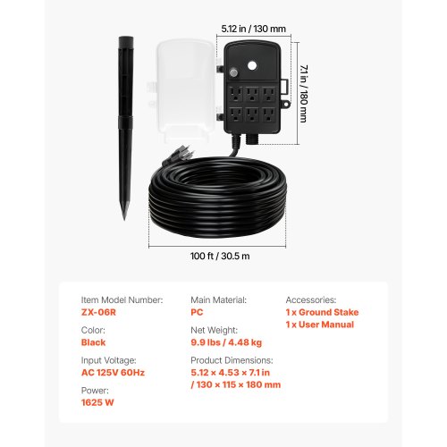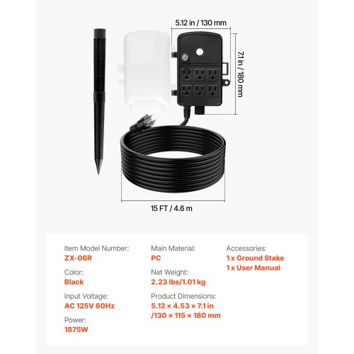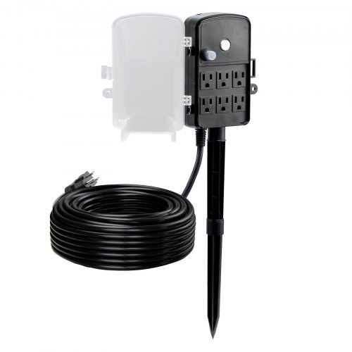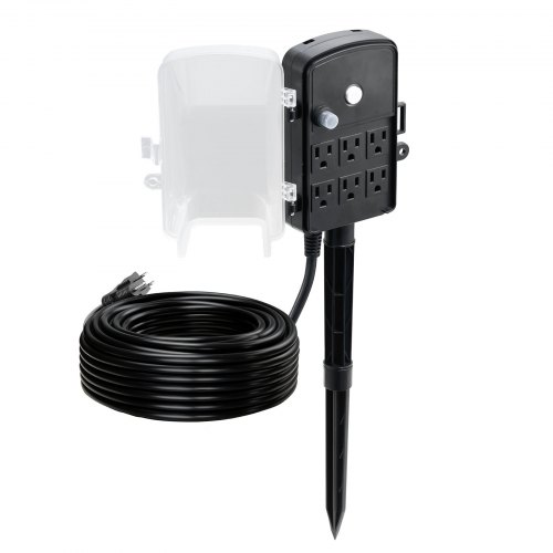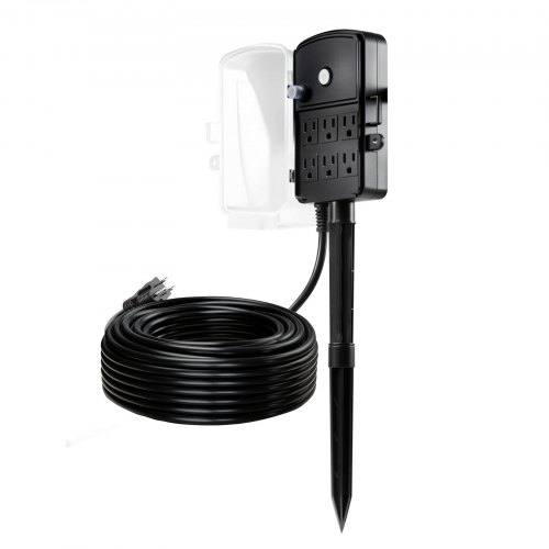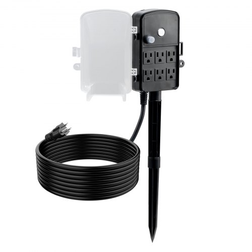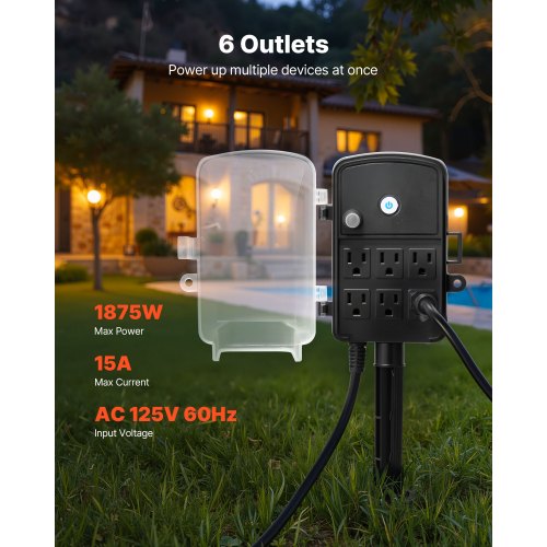 VEVOR Outdoor Power Stake, 15 FT Extension Cord, Outdoor Power Strip Weatherproof with Cover and Overload Protection, 6 Outlets, 15A/1875W, Waterproof Multi-Outlet Yard Stake for Christmas Lights