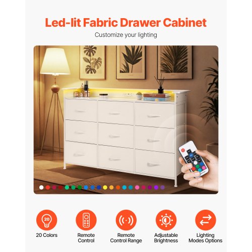 VEVOR 9 Drawer Dresser, Tall Drawer Dresser with Fabric Bin, Closet Storage Drawers with Sturdy Metal Frame, LED Lights & Built-in Outlet, Fabric Storage Tower for Bedroom, Hallway, Closet, White