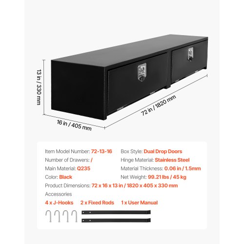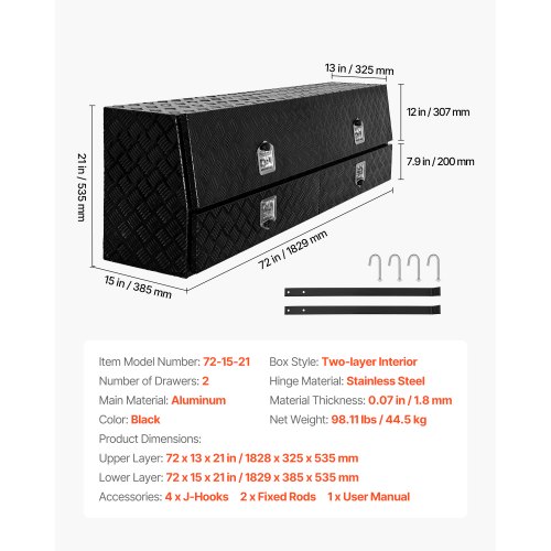 VEVOR Contractor Truck Tool Box, 72 x 21 x 13 in, Black Tread Aluminum TopSider Toolbox with Two Lower Drawers, Flip Up Door, Weather-Resistant Heavy Duty Storage Box with Latch, for Truck Bed Pickup
