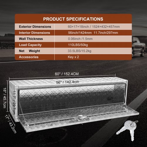 VEVOR Crossover Truck Tool Box, 69x20x18 In, Heavy Duty Aluminum Toolbox with Diamond Texture, Pick Up Truck Bed RV Trailer Toolbox, Waterproof Storage Organizer with Lock, Keys, Side Handles, Black