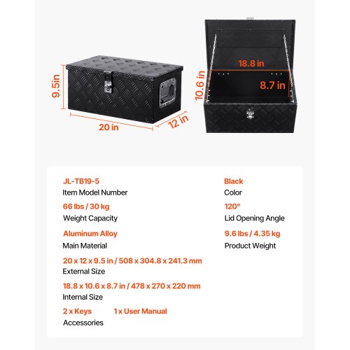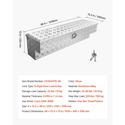 VEVOR Trailer Tongue Box, Aluminum Alloy Diamond Plate Tongue Box Tool Chest, Heavy Duty Trailer Box Storage with Lock and Keys, Utility Trailer Tongue Box for Pickup Truck, RV, Trailer, 33"x19"x18"
