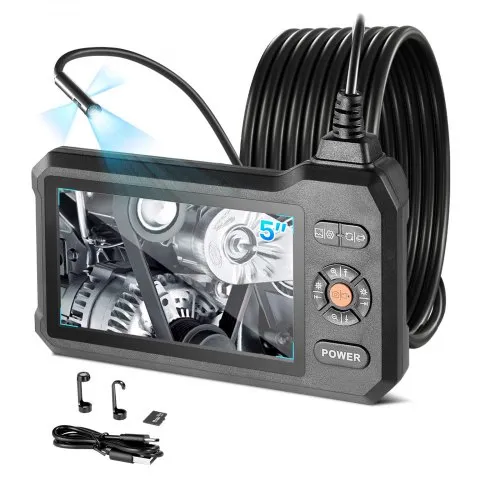 VEVOR Triple Lens Endoscope with Light, 5" HD IPS Screen Industrial Borescope, 1280 x 720 Lens, 8 + 2 LEDs, 8X Zoom, IP67 Waterproof Inspection Snake Camera for Auto, Plumbing (16.4FT Rigid Cable)