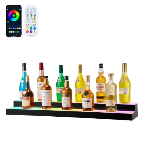 VEVOR LED Lighted Liquor Bottle Display, 3 Tiers 48 Inch Commercial Illuminated Home Bar Shelf, 3 Steps Whiskey Rack Stand, Acrylic Drink Shelves with RF Remote & App Control, and Multicolor lighting
