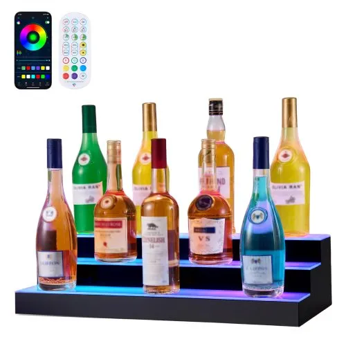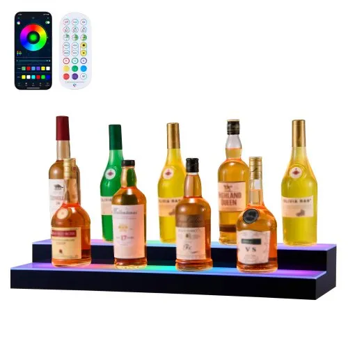 VEVOR LED Lighted Liquor Bottle Display, 3 Tiers 24 Inch Commercial Illuminated Home Bar Shelf, 3 Steps Whiskey Rack Stand, Acrylic Drink Shelves with RF Remote & App Control, and Multicolor lighting