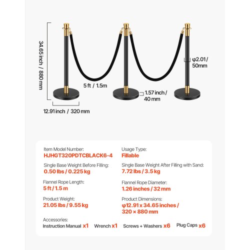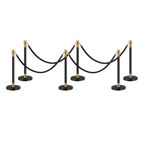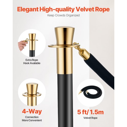 VEVOR Crowd Control Stanchion, Set of 6 Pieces Stanchion Set, Stanchion Set with 5 ft/1.5 m Black Velvet Rope, Black Crowd Control Barrier with Sturdy Concrete and Metal Base – Easy Connect Assembly