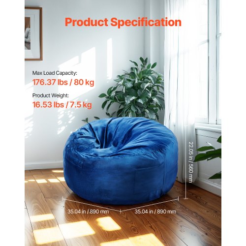VEVOR Bean Bag Chair, Round BeanBag Chair with Removable & Washable Cover for Adult, Dutch Velvet & High-Density Foam Filling Adult Bean Bag with Handle and Side Pocket for Living Room, Bedroom, Blue