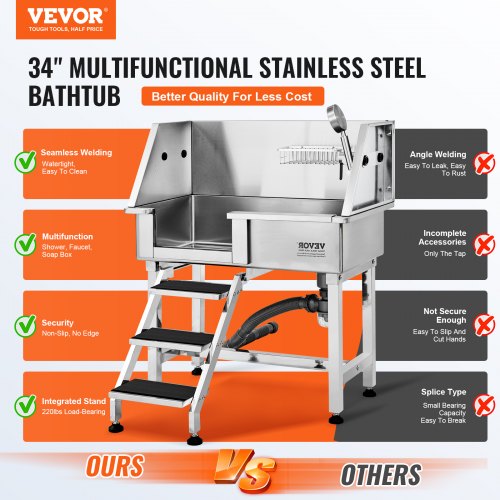 VEVOR 34" Pet Dog Bathing Station w/Ramp, Professional Stainless Steel Dog Grooming Tub w/ Storage Drawer, Faucet,Rich Accessory, Dog Bathtub for Large,Medium,Small Pets, Washing Sink for Home(Right)