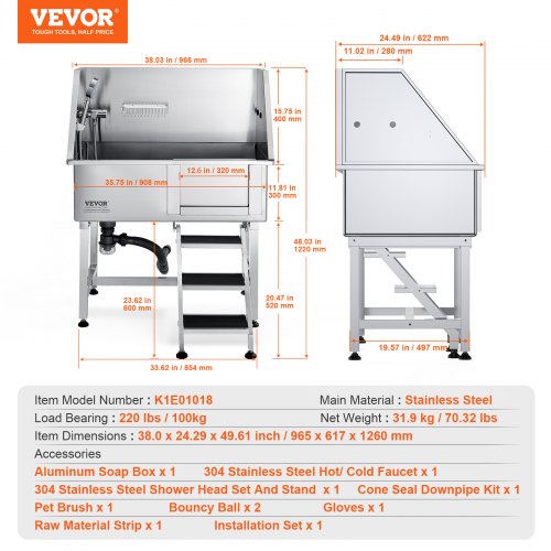 VEVOR 38" Pet Dog Bathing Station w/Ramp, Professional Stainless Steel Dog Grooming Tub w/ Storage Drawer, Floor Grate, Faucet, Dog Bathtub for Large,Medium,Small Pets, Washing Sink for Home(Right)