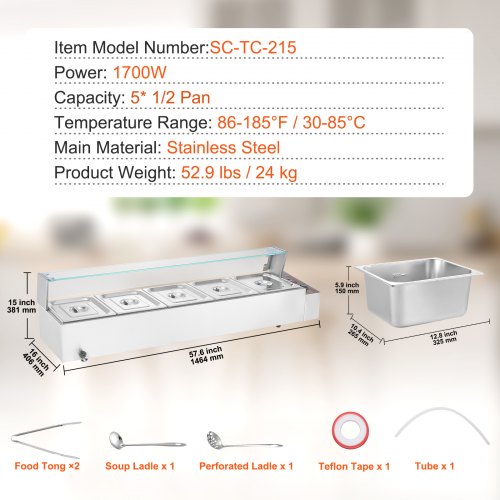 VEVOR 24QT Commercial Food Warmer, 5-Pan Electric Steam Table, 1200W Professional Countertop Stainless Steel Buffet Bain Marie with 86-185°F Temp Control for Catering, Buffet, Parties, Restaurants