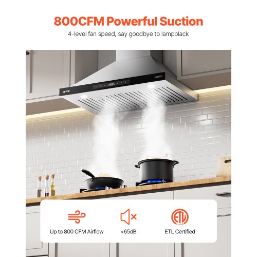 VEVOR Wall Mount Range Hood, 30 inch Chimney-Style Ceiling Mount Vent, 800 CFM Stainless Steel Kitchen Stove Hood with Gesture & Touch Control, LED Light, Baffle Filters, Ducted/Ductless Convertible