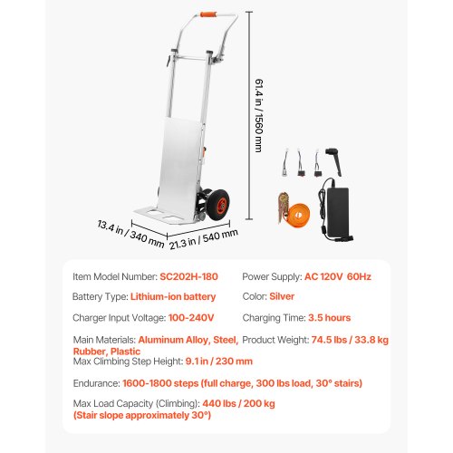 VEVOR Electric Stair Climbing Dolly, 440lbs Electric Stair Climbing Hand Trucks with 157.5in Rope & Extendable Handle, Heavy Duty Stair Climber for Warehouse Logistics, Moving Furniture(Silver)