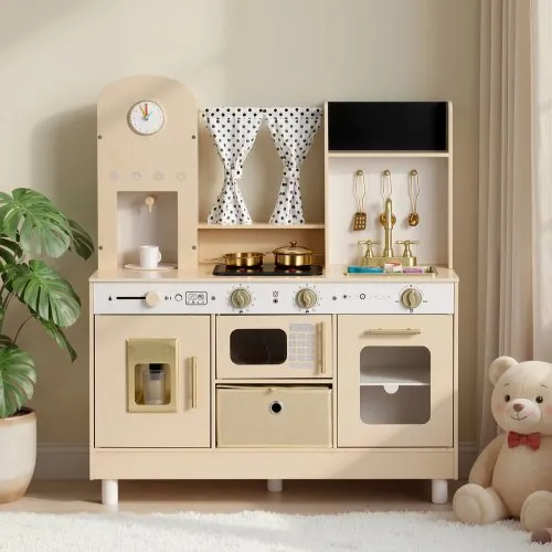 VEVOR Play Kitchen for Kids, Wooden, Kids Kitchen Playset with Realistic Lights & Sounds, Food & Cookware, Modern Style Pretend Play Toy Set, Ice Maker, Microwave, for Toddlers, Girls & Boys Ages 3-8