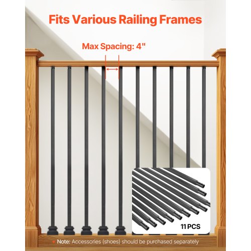 VEVOR Staircase Balusters 11 Pack, 44 Inch Durable Carbon Steel Stair Balusters, 0.5 Inch Indoor Square Metal Spindle Railing, Corrosion-Proof Hollow Deck Railing with Pre-Drilled Holes, Matte Black