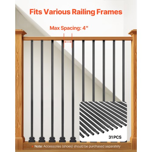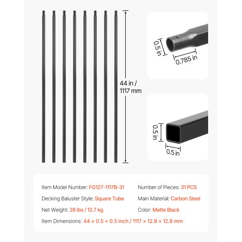 VEVOR Staircase Balusters 31 Pack, 44 Inch Durable Carbon Steel Stair Balusters, 0.5 Inch Indoor Square Metal Spindle Railing, Corrosion-Proof Hollow Deck Railing with Pre-Drilled Holes, Matte Black