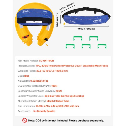 VEVOR Manual Inflatable Belt Pack for Adults, 105N Buoyancy, Over 80 Pounds and Up to 59 in Waist Adjustable, Inflatable PFD Waist for SUP Paddelboarding, Kayaking, Black (CO2 Cylinder Not Included)