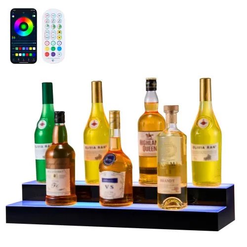 VEVOR LED Lighted Liquor Bottle Display, 3 Tiers 24 inches, Supports USB, Acrylic Illuminated Home Bar Shelf Display with RF Remote & App Control, 9 Static Colors, Timing Mode, for 18-24 Bottles