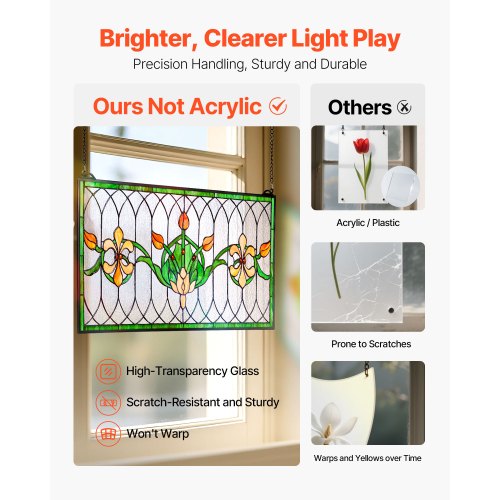 VEVOR Stained Glass Window Panel, 20 x 21 in, Tiffany Style Hanging Transom Window Panel with Chain, Large Vertical Rectangle Stain Glass, Vintage Traditional Art Handcrafts for Kitchen Home Decor