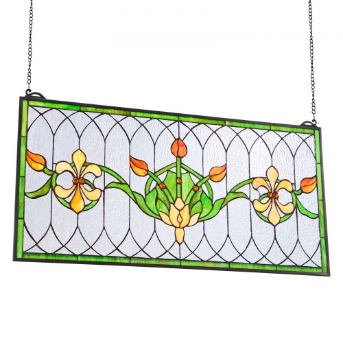 VEVOR Stained Glass Window Panel, 26 x 16 in, Tiffany Style Hanging Transom Window Panel with Chain, Large Horizontal Rectangle Stain Glass, Vintage Traditional Art Handcrafts for Kitchen Home Decor