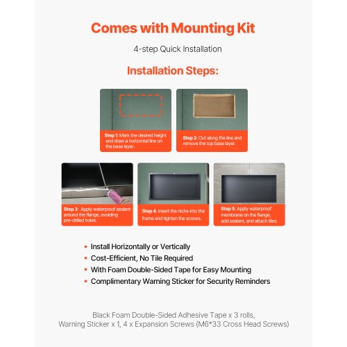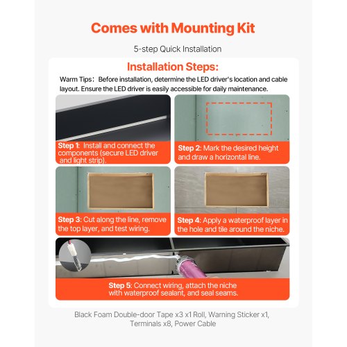 VEVOR Shower Niche, 13 x 25 x 4 inch Recessed Wall Niche With LED Strip,Heavy-duty Stainless Steel Modern Shampoo Storage Organizer,Sealed Waterproof, Durable & Easy to Install,Black for Bathroom