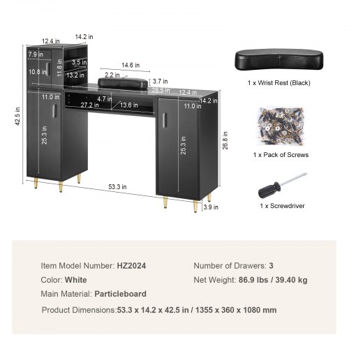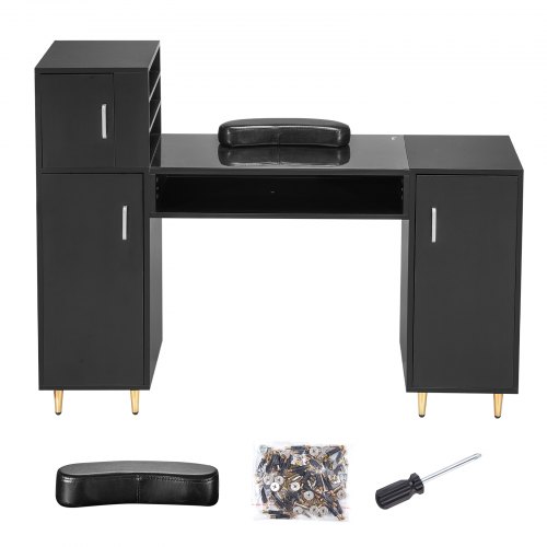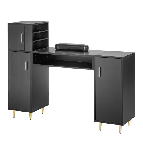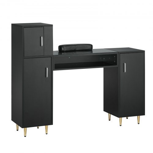 VEVOR Manicure Table, Glass Top Nail Desk, Makeup Dressing Nail Station with Storage Cabinets, Acetone-Resistant Nail Tech Table for Spa Beauty Salon Workstation with Wrist Rest, 8 Metal Legs, Black