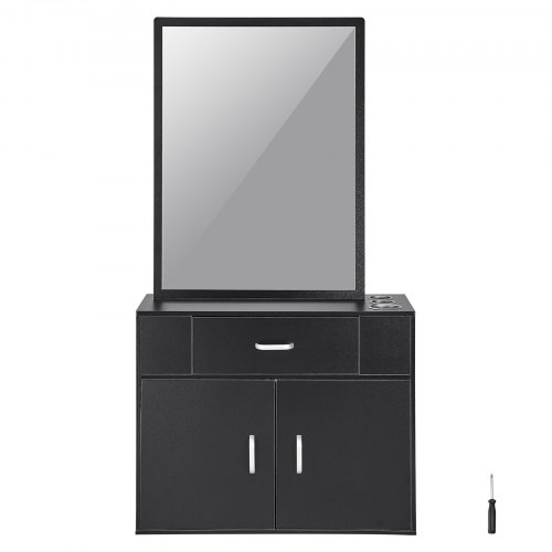 VEVOR Salon Organizer, Wall-Hanging Unit for Hairdressers, Complete with 3 Holders, Mirror, Dual-Door Storage, and Single Drawer, Black